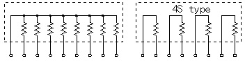 Một số mạng điện trở có chữ "4S" được in trên đỉnh của mạng điện trở. 4S chỉ ra rằng gói chứa 4 điện trở độc lập không được nối với nhau bên trong. Nhà ở có tám khách hàng tiềm năng thay vì chín. Hệ thống dây điện bên trong của các mạng điện trở điển hình này đã được minh họa dưới đây. Kích thước (phần màu đen) của mạng điện trở mà tôi có như sau: Đối với loại có 9 đạo trình, độ dày là 1,8 mm, chiều cao 5 mm và chiều rộng 23 mm. Đối với các loại có 8 dây dẫn thành phần, độ dày là 1,8 mm, chiều cao 5 mm và chiều rộng 20 mm.