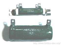 Bức ảnh bên trái là điện trở dây. Cái trên là 10W và có chiều dài 45 mm, độ dày 13 mm. Công suất thấp hơn là 50W và có chiều dài 75 mm, độ dày 29 mm. Phía trên có phụ kiện kim loại kèm theo. Các thiết bị này được cách nhiệt bằng một lớp phủ gốm. |