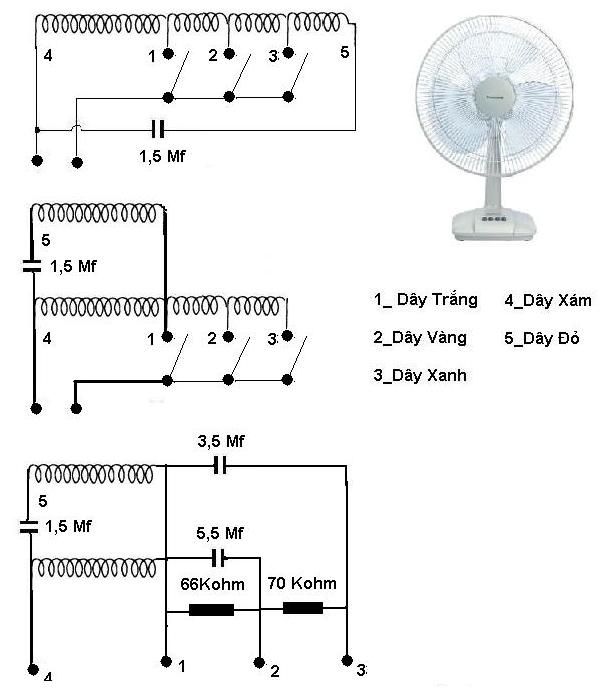 - Cuộn dây quạt khi bị cháy, ta nên đổi một cuộn khác, khoảng từ 100.000 -300.000 đồng tuỳ theo cơ sở sản xuất quấn dây nội hay ngoại. Lúc gắn, nhớ chú ý đến dây dẫn được lắp ở mặt trước hay sau .Các bạn đấu dây theo sơ đồ sau ;