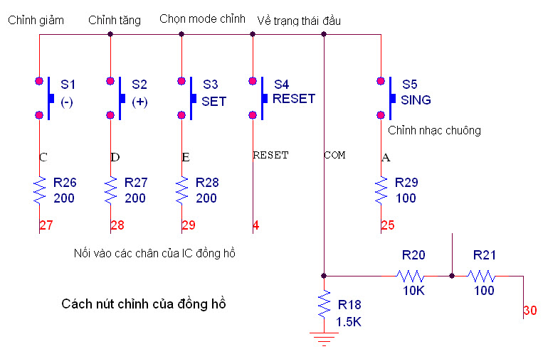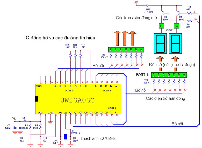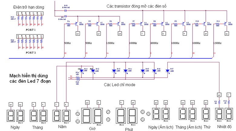 Qua sơ đồ mạch điện trên Bạn thấy, chân chung của các Led sẽ cho nối vào vào các chân C của các transistor, khi transistor dẫn điện và lúc này các chân trên Port của IC đồng hồ xuống mức áp thấp thì các Led tương ứng sẽ phát sáng và chúng ta sẽ thấy các con số hiện trên các đèn số. Trong mạch người ta dùng các điện trở hạn dòng giữ cho dòng qua các Led không quá lớn.