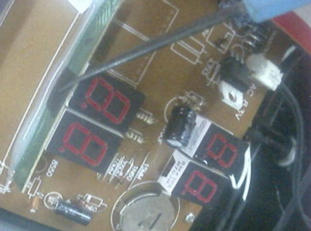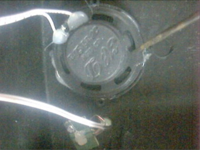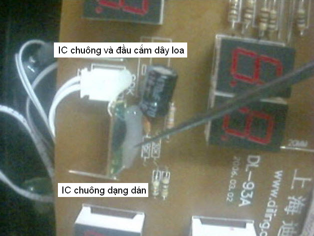 Hình 5: Trong bảng đèn người ta dùng một loa nhỏ để cho báo nhạc chuông. Loa nhỏ nhẹ và được dùng keo dẽo cho dán dình trên bảng đèn. Ở đây người ta cũng gắn một nhiệt trở (mới nhìn hình giống diode 1N4148) để dò nhiệt độ phòng.