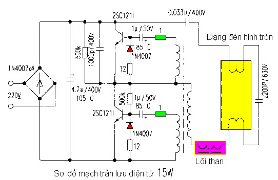 * Qua tụ 0.033uF (chịu áp 400V), điện áp cao sẽ kích sáng đèn, trong mạch dùng cuộn cảm để ổn dòng qua đèn. Tụ 2200pF tạo dòng nung nóng tim đèn làm giảm mức áp kích đèn, giữ cho đèn bị bị đen ở hai đầu.