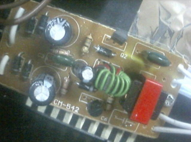 Hình 4 : Hình chụp cho thấy bộ trấn lưu điện tử, nó là một mạch dao động kéo đẩy làm việc ở mức áp cao, mạch cấp điện áp cáo để kích sáng một đèn ống neon (thường dùng loại ống hình tròn). Mạch này rất dễ hư. Các hư hỏng thường ở các transistor, tụ lọc nguồn có mức chịu áp cao (400V), đôi khi gây chạm ở các diode nắn dòng làm cháy mạch (vết đen nám rất dễ nhận ra).