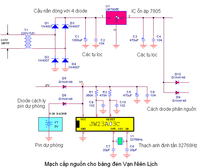 * Pin dự phòng 3V, qua diode cách lý D6 (1N4148) để cấp điện cho mạch đếm trong IC đồng hồ mỗi khi bảng đèn bị mất điện, chúng ta biết:
