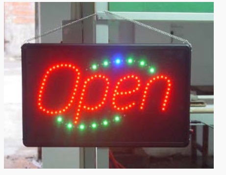 Hình chụp cho thấy chữ Open được tạo ra từ các Led màu. Bảng đèn dùng một IC vi điều khiển khiến với các transistor thúc làm cho các Led có nhiều dạng nhấp nháy, trông rất khoái mắt, Bạn có thích không?