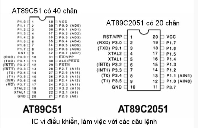 Một thí dụ: Với IC AT89C51 có 40 chân, chúng ta có 4 cảng, đó là các cảng P0, P1, P2 và P3. Và với IC AT89C2015 có 20 chân, có 2 cảng P1, P3 (Bạn xemm hình).
