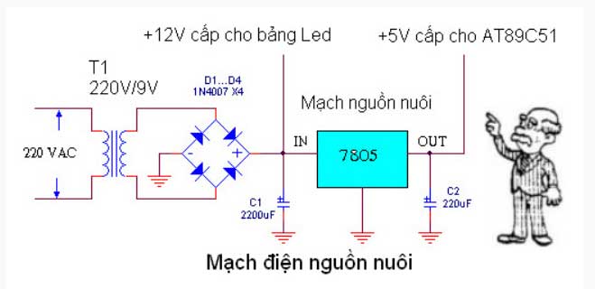 Ở đây, đường nguồn 15V (có thể dùng cấp điện cho các Led ở bảng đèn quảng cáo, với loại mạch có dùng transistor thúc), nó tạo ra đường nguồn 5V ổn định dùng để cấp điện cho IC AT89C51.