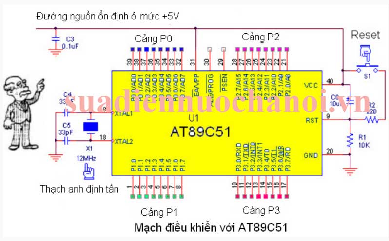 * Chân 18 và chân 19 nối vào thạch anh định tần cho xung nhịp (Xung nhịp được như trái tim của IC vi điều khiển).