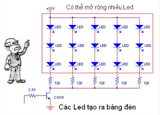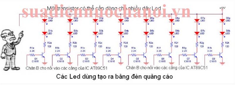 Bạn dùng nhiều Led màu ráp thành chữ, và dùng IC vi điều khiển để làm cho các Led này nhấp nháy, hay tạo ra chữ biết chạy, chữ đổi màu, chữ sáng lan tỏa ra, thu hẹp vào... nhờ vậy gây ra được hiệu ứng độc đáo cho các bảng đèn quảng cáo của các cửa hàng. Theo tôi biết, đề tài này vốn rất được nhiều Bạn ưa thích, phải không?