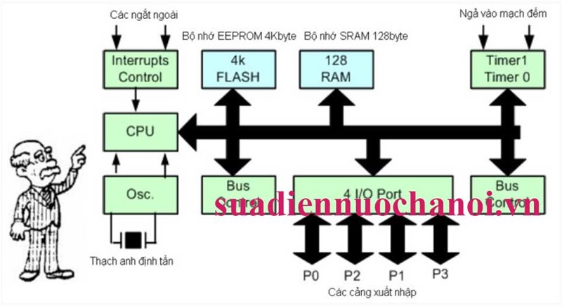 * Khối dao động (OSC) dùng để tạo ra xung nhịp, xung nhịp cần dùng để vận hành các hoạt động của IC vi điều khiển. Tần số xung nhịp lấy theo thạch anh (gắn trên chân 18-19). Ở đây, chúng ta thường dùng thạch anh 12MHz.
