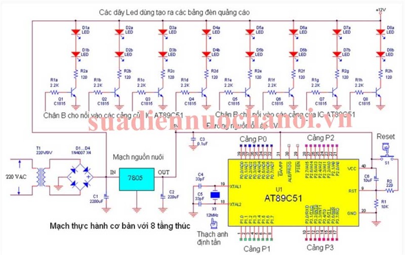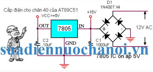 * Dùng IC ổn áp 3 chân học 78xx (7805) để có đường nguồn 5V có độ ổn định cao, cấp cho IC AT89C51.