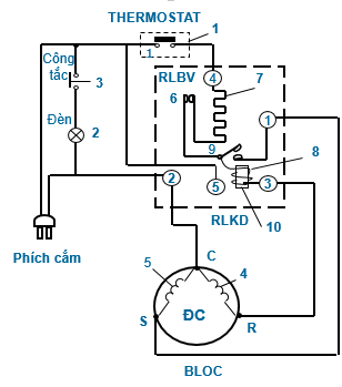 Rơle nhiệt làm nhiệm vụ bảo vệ động cơ quá tải về nhiệt. Trong trường hợp động cơ khởi động quá lâu mà cũng không khởi động được hoặc lốc máy nhiệt độ cao quá 1000C, rơle nhiệt 6 mở tiếp điểm, cắt động cơ khỏi lưới điện.